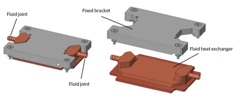 For a cold plate assembly with integrated pipes, the cold plate typically consists of a fluid heat exchanger containing flow channels and a fixing bracket. The fluid heat exchanger is connected to the pipes through metal connection processes such as welding, brazing, or soldering. For cold plates using machined or molded flow channels, their components include a flow channel heat exchanger, a fixing bracket, and a fluid connector (Figure 1). The fluid connector is installed on the heat exchanger to guide the coolant to flow through the flow channels. The connector is fixed to the pipe with a hose clamp, while the fixing bracket provides structural support for the component stack and ensures the precise positioning of the heat exchanger on the processor.